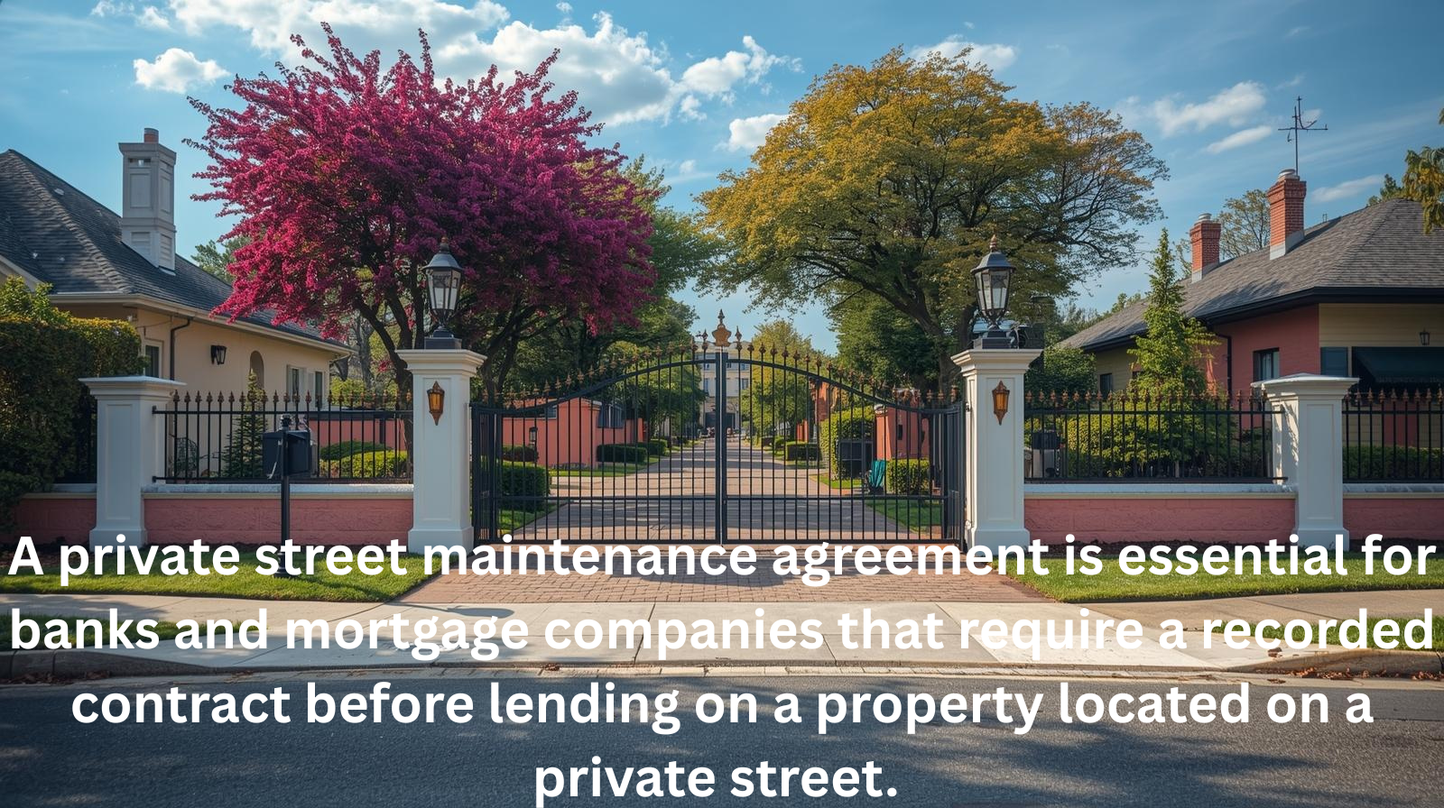 A private street maintenance agreement is crucial for legal and financial protection, ensuring responsibilities are clear and repairs are timely, especially since most mortgage companies require such an agreement when financing a property accessed by a private street.