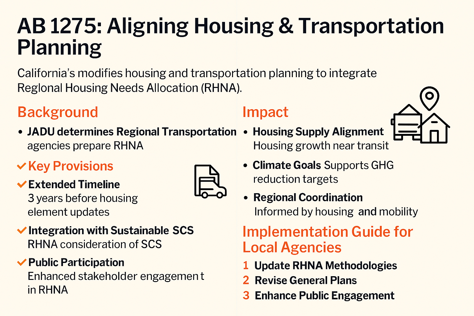 AB 1275 is a structural reform that links housing and transportation planning—two pillars of sustainable urban development. By aligning RHNA with RTPs, California aims to reduce sprawl, cut emissions, and create livable communities near jobs and transit. This is a long-term vision for a sustainable, resilient California.