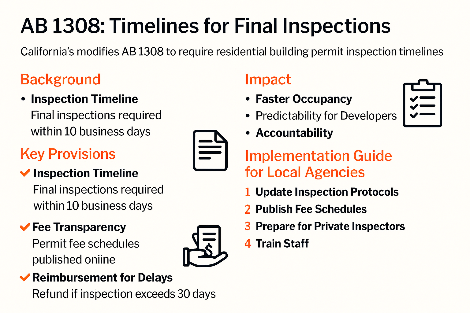 AB 1308 is a high-impact, low-cost reform that addresses one of the most overlooked barriers to housing delivery: inspection delays. By enforcing timelines and offering alternatives, California is making the final step of housing production faster and more predictable.