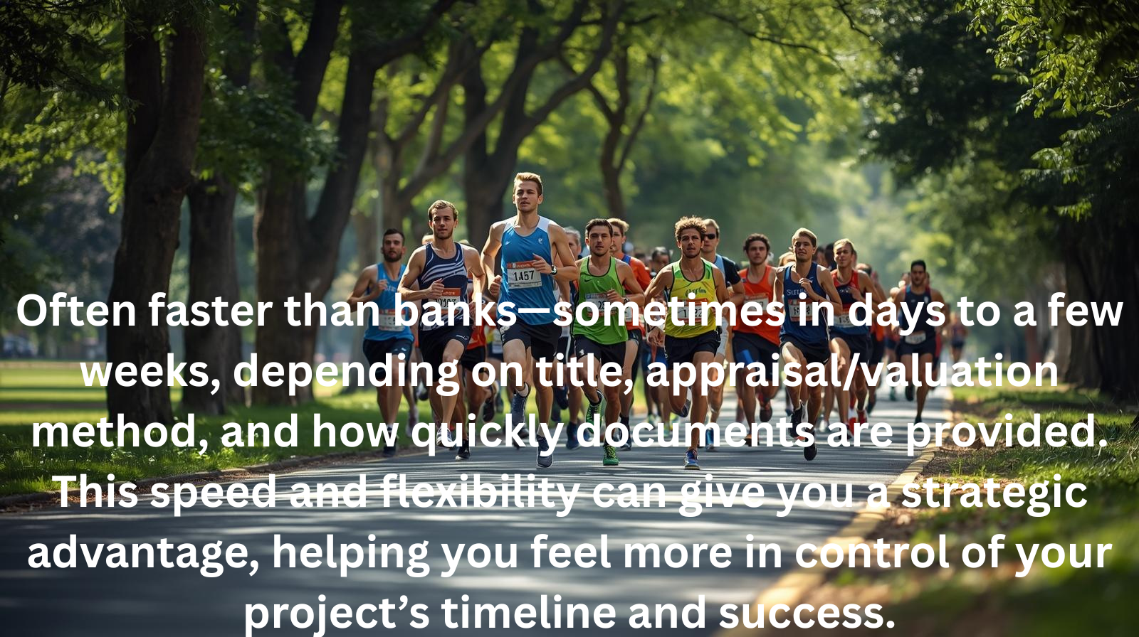 Often faster than banks—sometimes in days to a few weeks, depending on title, appraisal/valuation method, and how quickly documents are provided. This speed and flexibility can give you a strategic advantage, helping you feel more in control of your project’s timeline and success.
