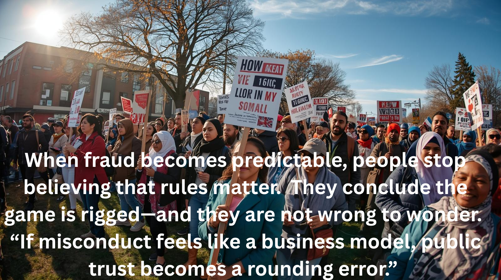 When fraud becomes predictable, people stop believing that rules matter. They conclude the game is rigged—and they are not wrong to wonder. “If misconduct feels like a business model, public trust becomes a rounding error.”