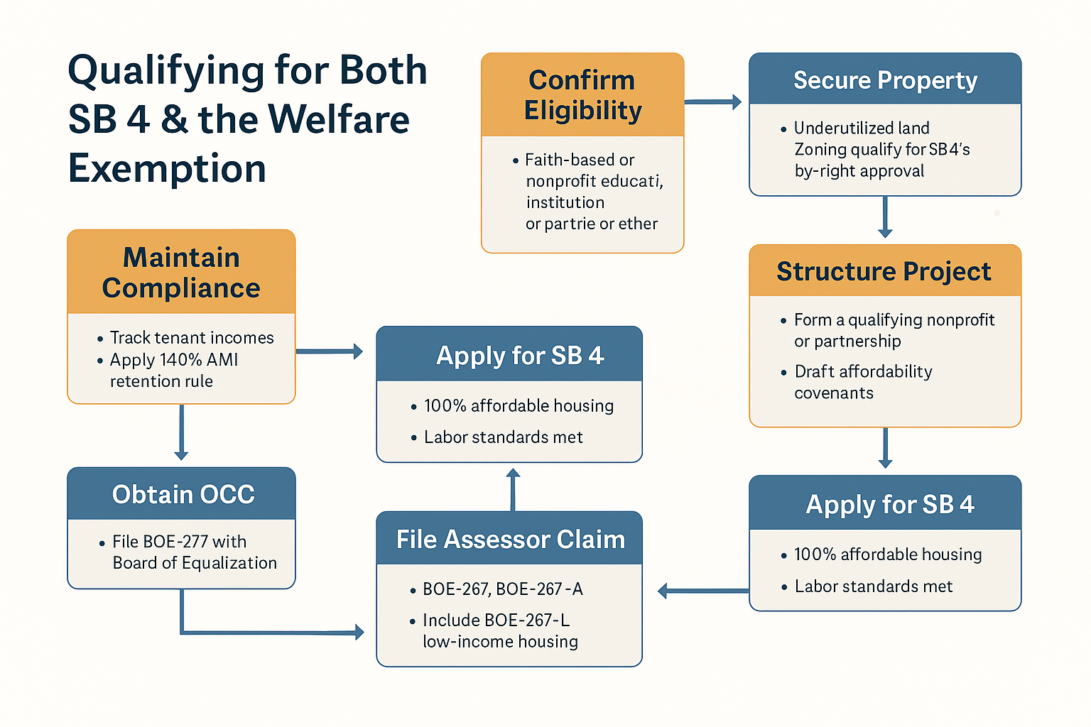 - Coordinate early between landowner (religious/educational nonprofit), developer, and tax counsel to align SB‑4 eligibility and § 214(g) structure.