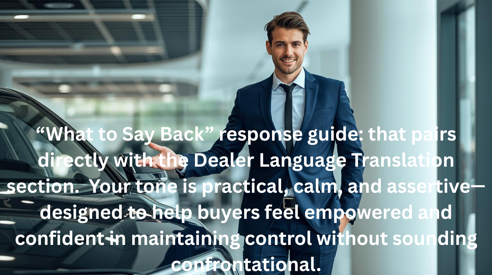 What to Say Back” response guide: that pairs directly with the Dealer Language Translation section. Your tone is practical, calm, and assertive—designed to help buyers feel empowered and confident in maintaining control without sounding confrontational.
