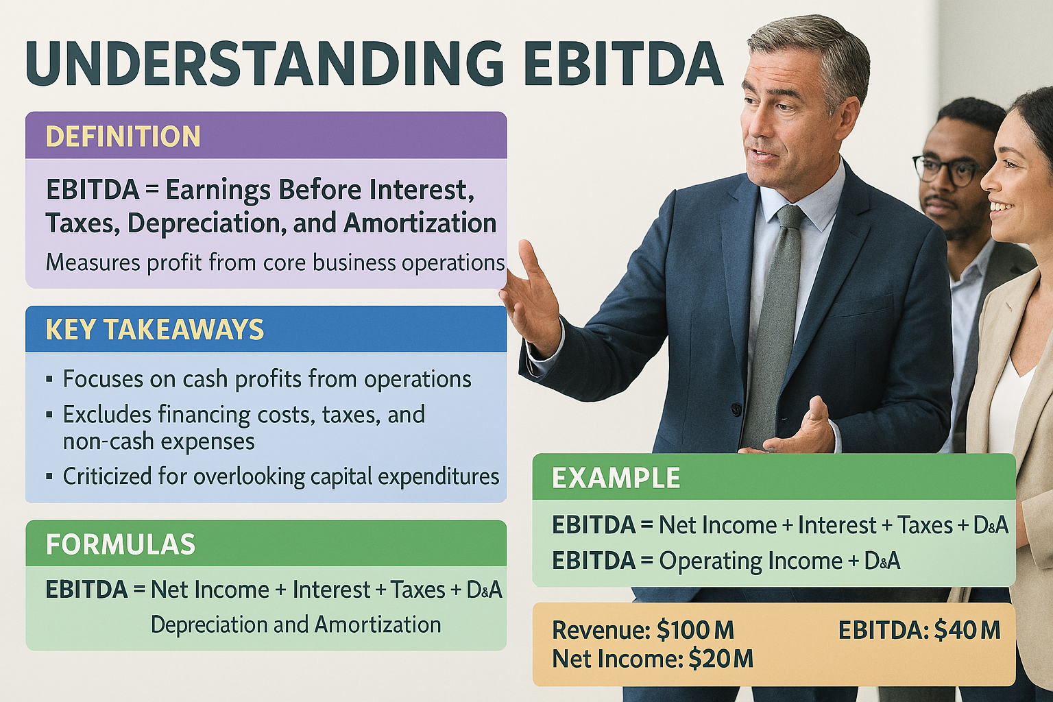 - EBITDA highlights a company’s operating profitability, helping investors assess fundamental health.
