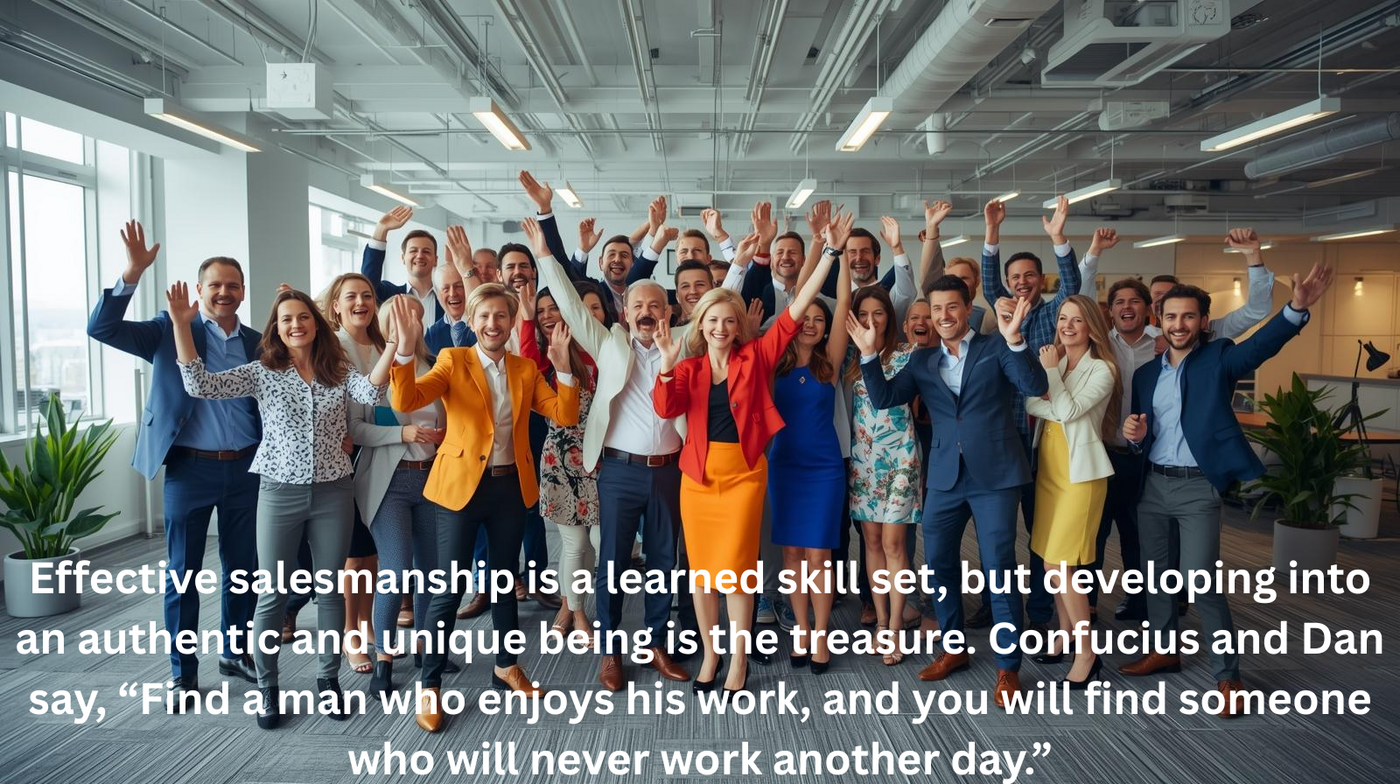 Effective salesmanship is a learned skill set, but developing into an authentic and unique being is the treasure. Confucius and Dan say, “Find a man who enjoys his work, and you will find someone who will never work another day.”