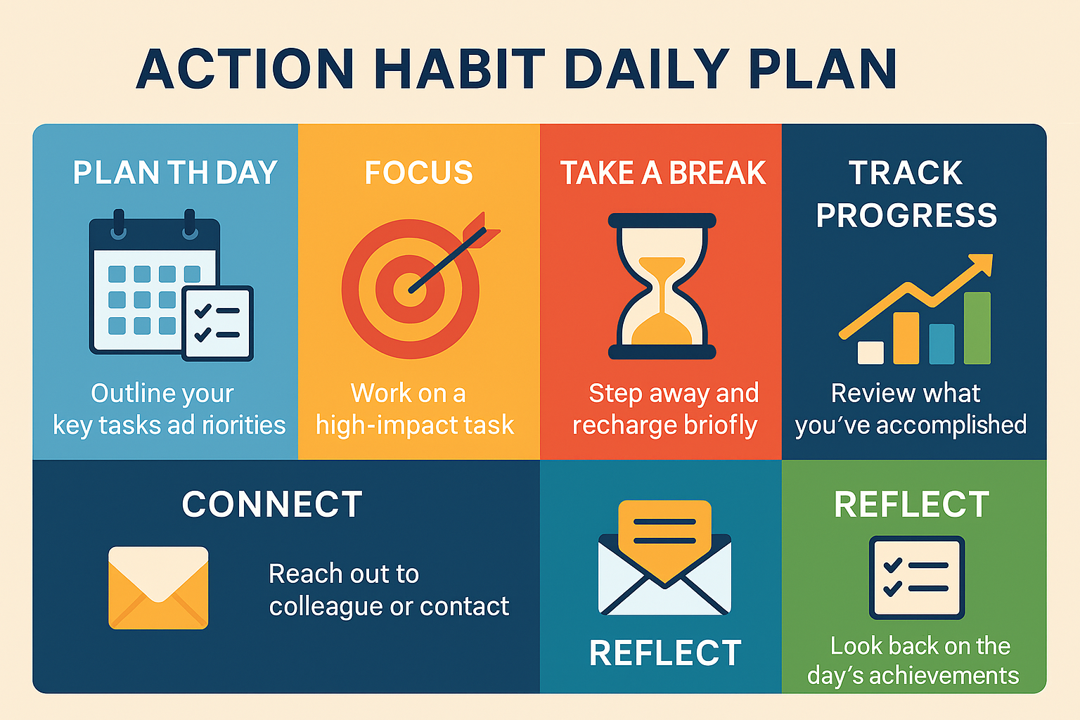 - Daily review (5 min): Reflect on wins and adjust for tomorrow.