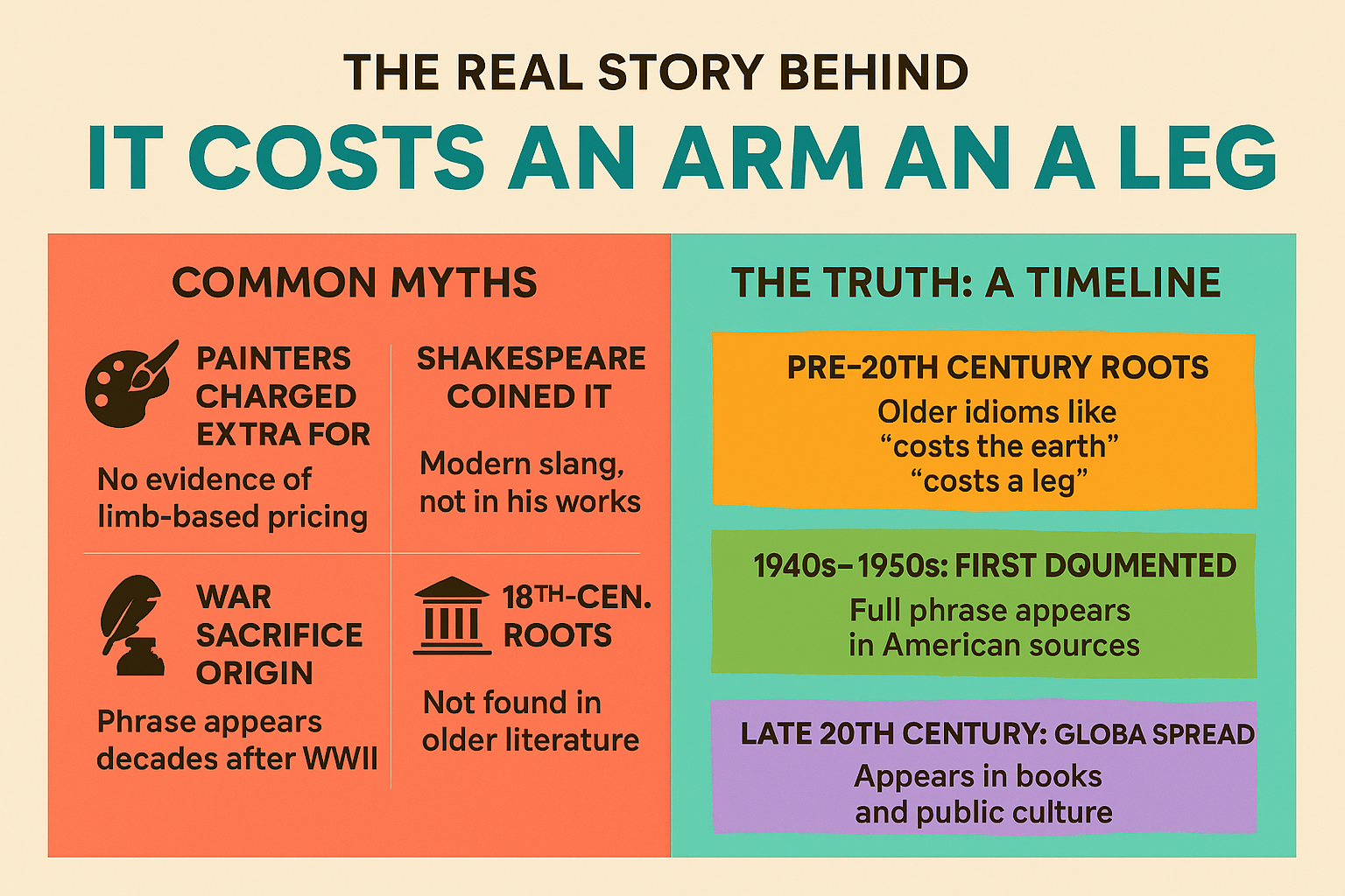 So, let’s set the record straight. Forget the painters, soldiers, and Shakespeare. This phrase, ‘It costs an arm and a leg,’ is a mid-century American exaggeration that evolved from older cost-related idioms. Now that we’ve traced its real evolution, you’re armed with the truth.