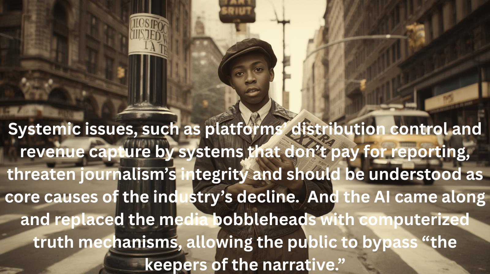 Systemic issues, such as platforms’ distribution control and revenue capture by systems that don’t pay for reporting, threaten journalism’s integrity and should be understood as core causes of the industry’s decline. And the AI came along and replaced the media bobbleheads with computerized truth mechanisms, allowing the public to bypass “the keepers of the narrative.” For the same reason, Hollywood has collapsed as a co-conspirator of the Legacy Media. The town, arrogant and without pity, self-immolated. Both were driven by access to the U.S. government’s power structure. They served as a megaphone for the establishment, the administrative state, the NGOs, and the Institutions, all powerful, bureaucratically run organizations. Journalism didn’t fail the market. The market changed the rules and then billed journalism for the privilege of playing.