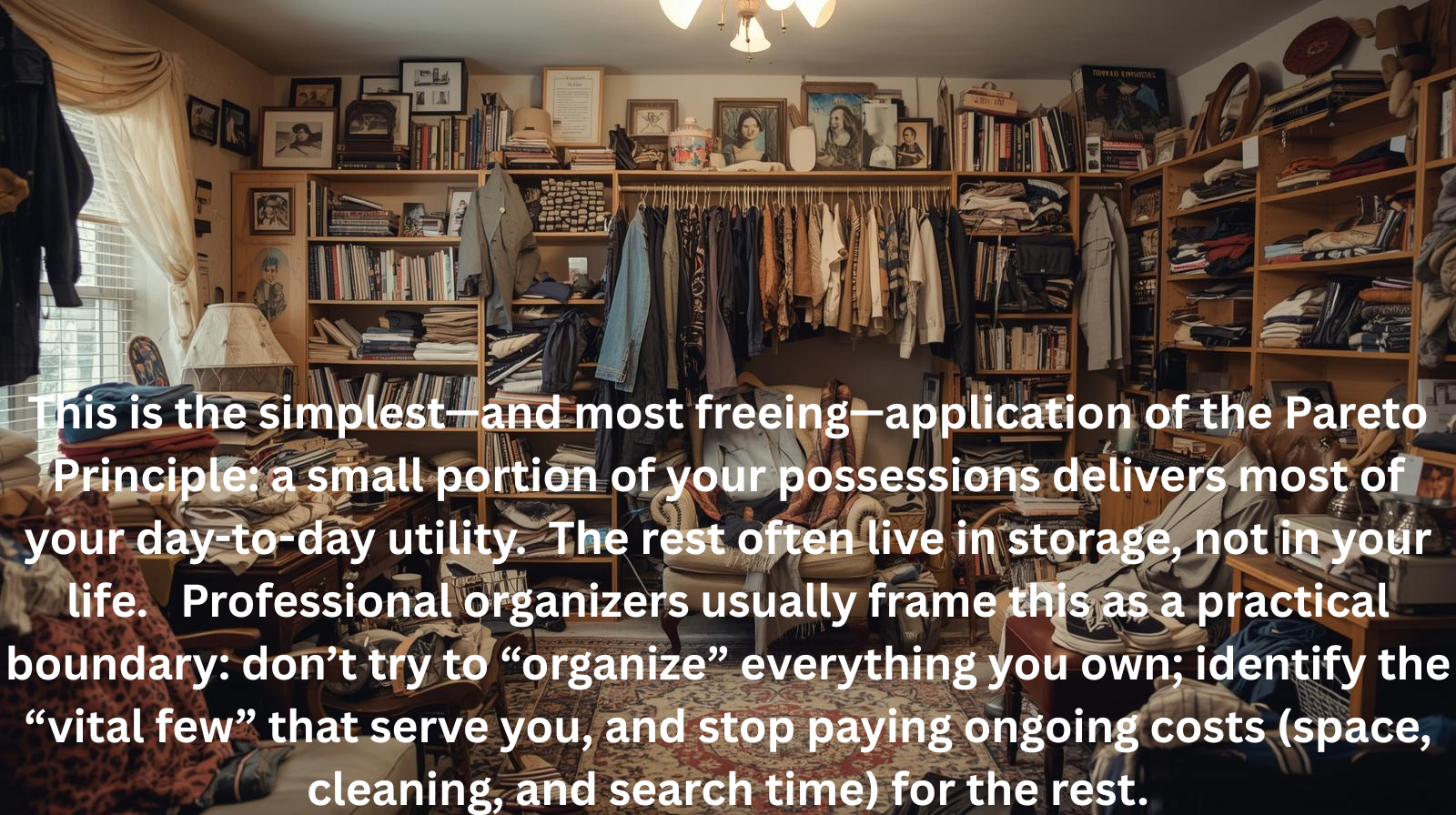 This is the simplest—and most freeing—application of the Pareto Principle: a small portion of your possessions delivers most of your day-to-day utility. The rest often live in storage, not in your life. Professional organizers usually frame this as a practical boundary: don’t try to “organize” everything you own; identify the “vital few” that serve you, and stop paying ongoing costs (space, cleaning, and search time) for the rest.