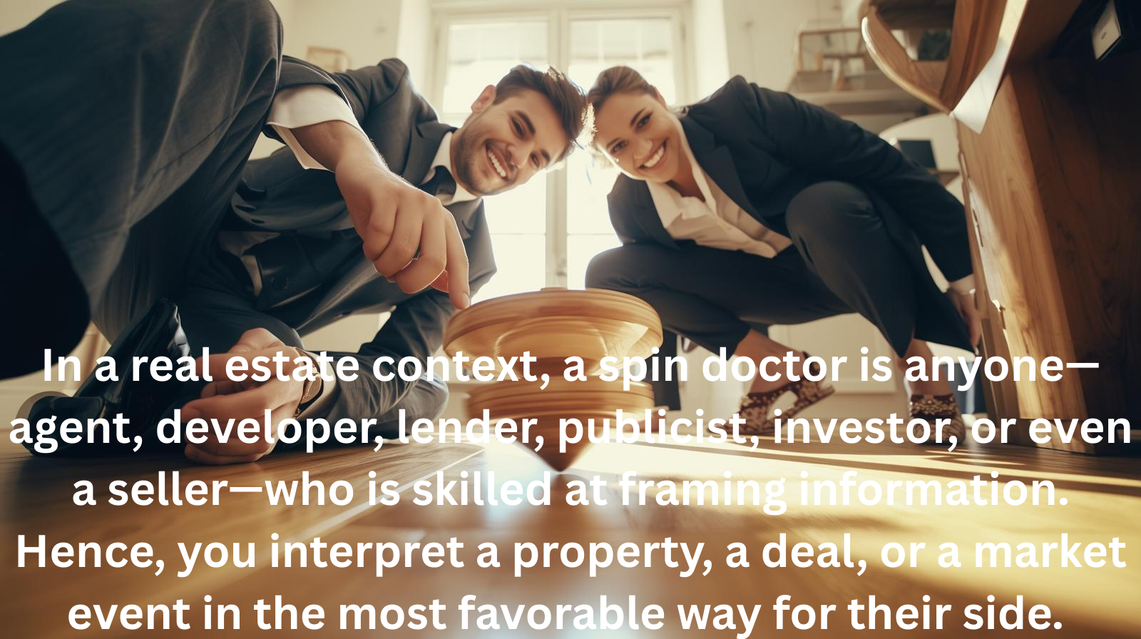 In a real estate context, a spin doctor is anyone—agent, developer, lender, publicist, investor, or even a seller—who is skilled at framing information. Hence, you interpret a property, a deal, or a market event in the most favorable way for their side. That’s consistent with standard definitions: a spin doctor is a person responsible for ensuring others interpret an event from a particular point of view, often by making things seem more positive than they really are.