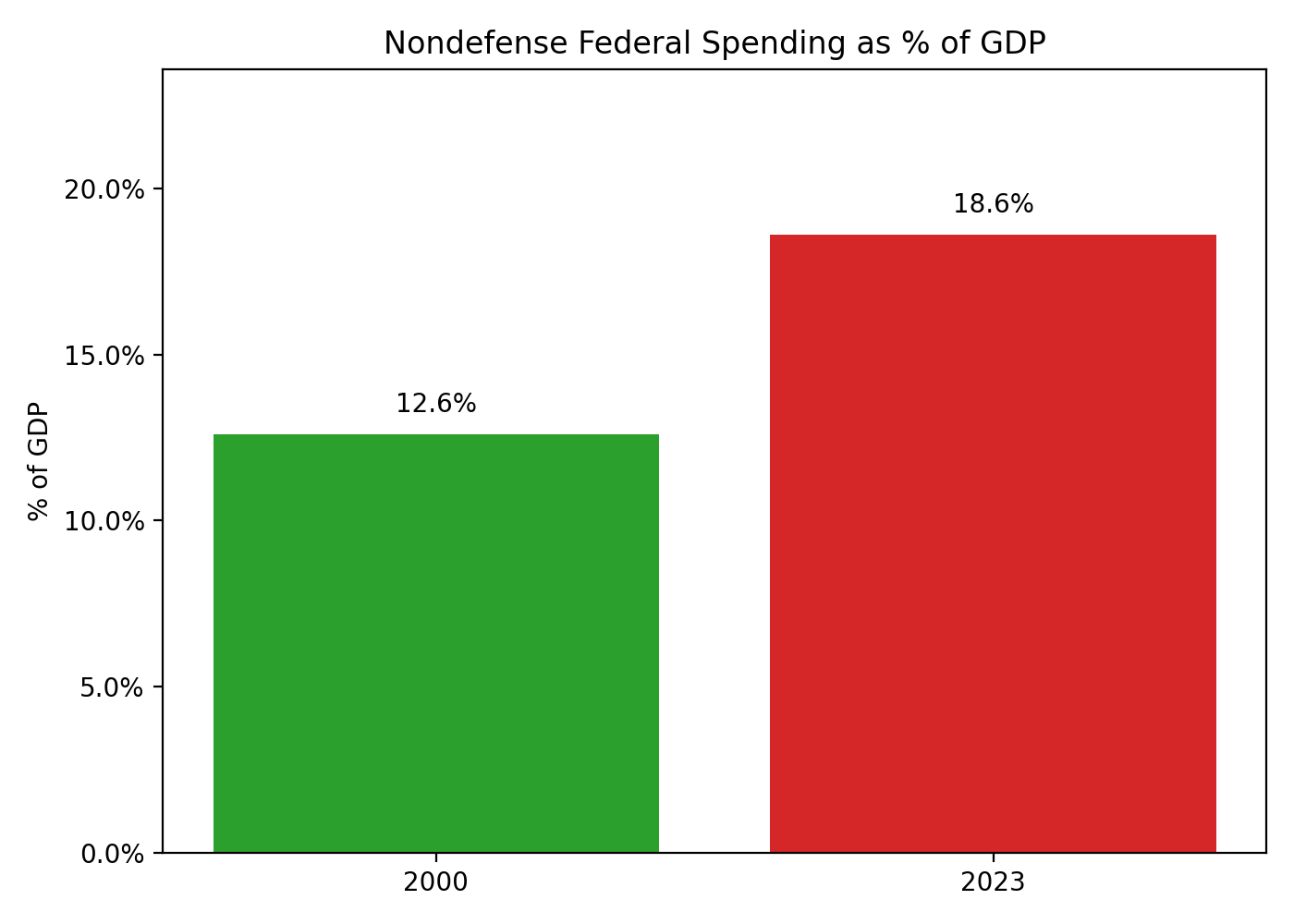- Non-defense spending has increased from 12.6% of GDP in 2000 to 18.6% in 2023, a 48% rise, driven by programs and administrative overhead rather than core services.