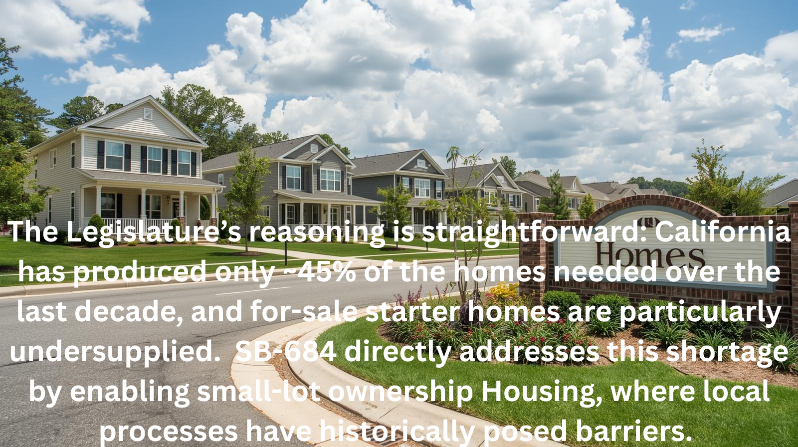 The Legislature’s reasoning is straightforward: California has produced only ~45% of the homes needed over the last decade, and for-sale starter homes are particularly undersupplied. SB-684 directly addresses this shortage by enabling small-lot ownership Housing, where local processes have historically posed barriers.