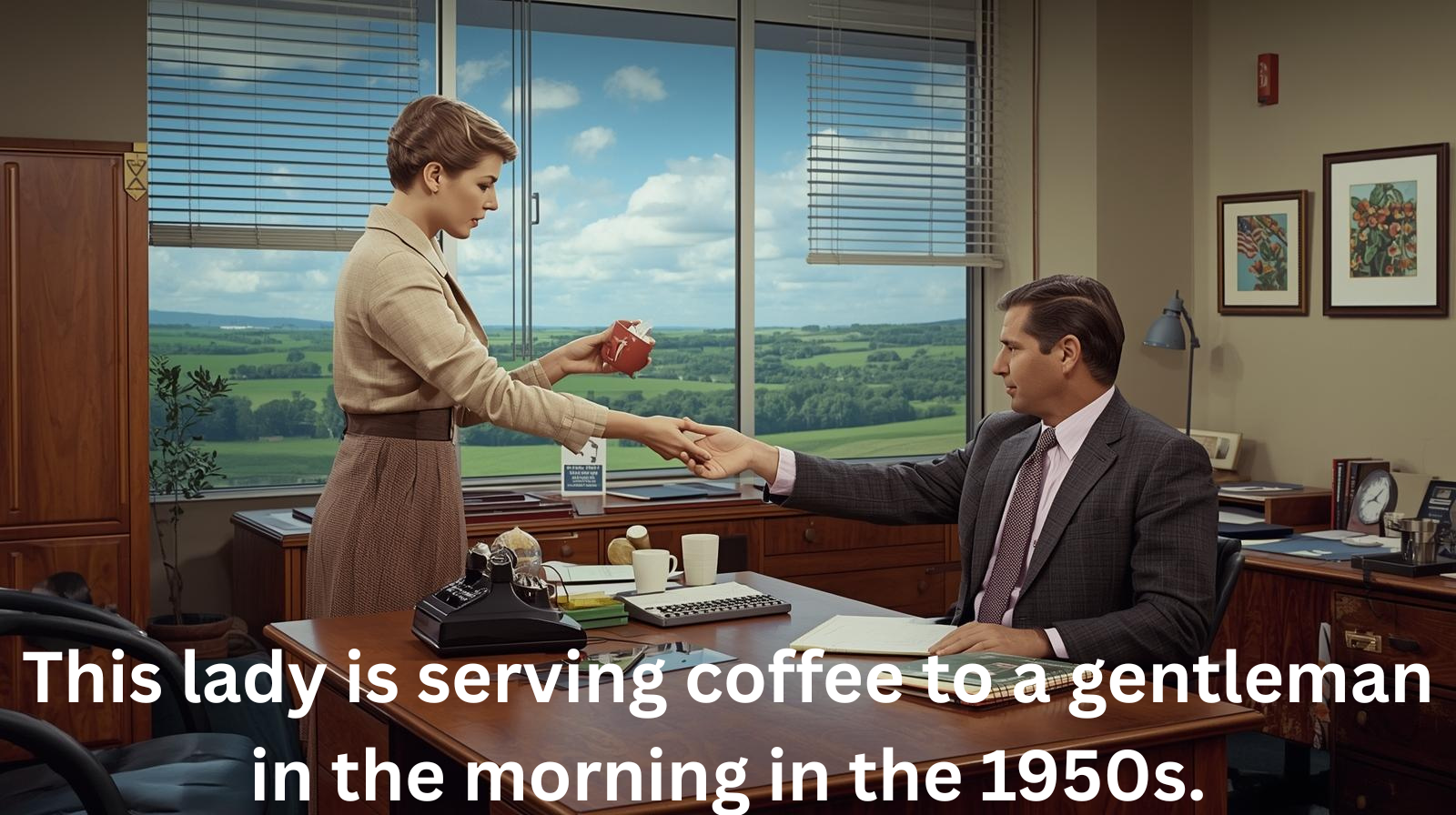 This lady is serving coffee to a gentleman in the morning in the 1950s.  What happened from then to now?  I don’t exactly understand that treatment.  How thoughtful and kind she was.  She appeared to be enamored with the boss and his status.  Was it an illusion?  Then I can assure you that it would be an illusion today!