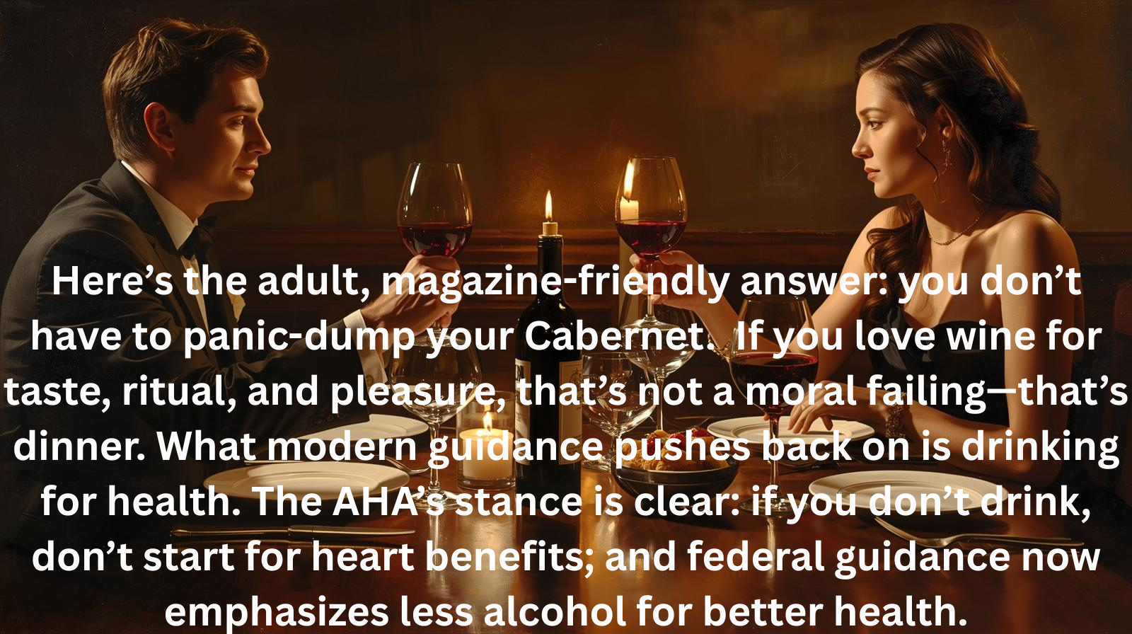 Here’s the adult, magazine-friendly answer: you don’t have to panic-dump your Cabernet. If you love wine for taste, ritual, and pleasure, that’s not a moral failing—that’s dinner. What modern guidance pushes back on is drinking for health. The AHA’s stance is clear: if you don’t drink, don’t start for heart benefits; and federal guidance now emphasizes less alcohol for better health.