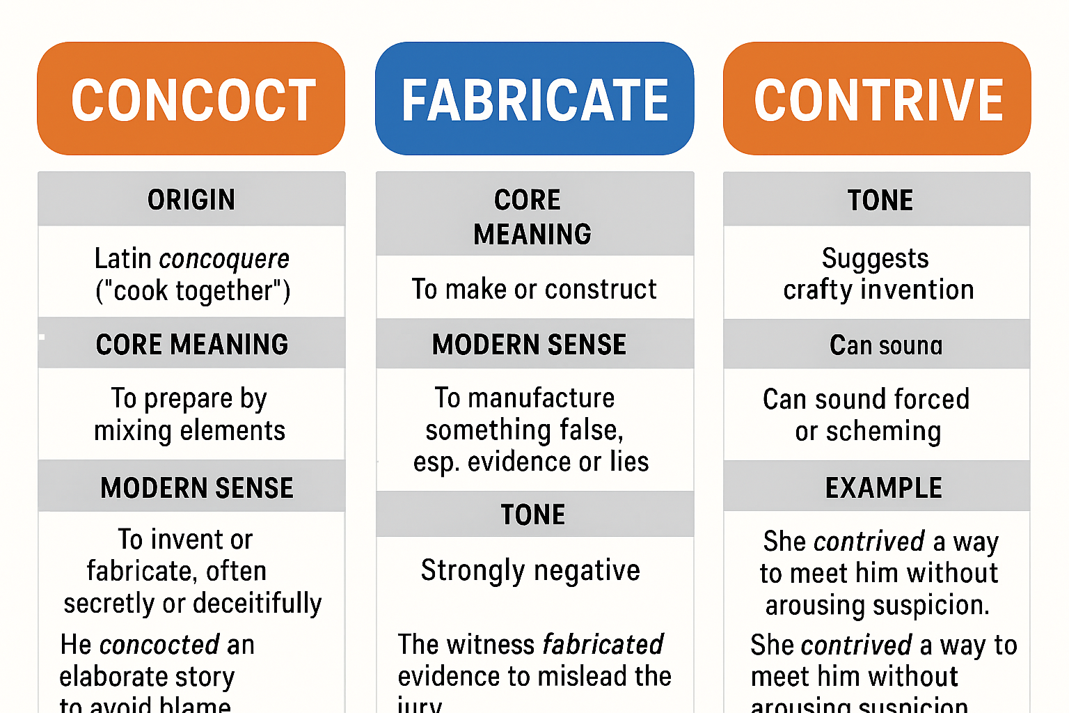 Here’s a comparison of “concoct,” “fabricate,” and “contrive” in terms of meaning, tone, and nuance:
