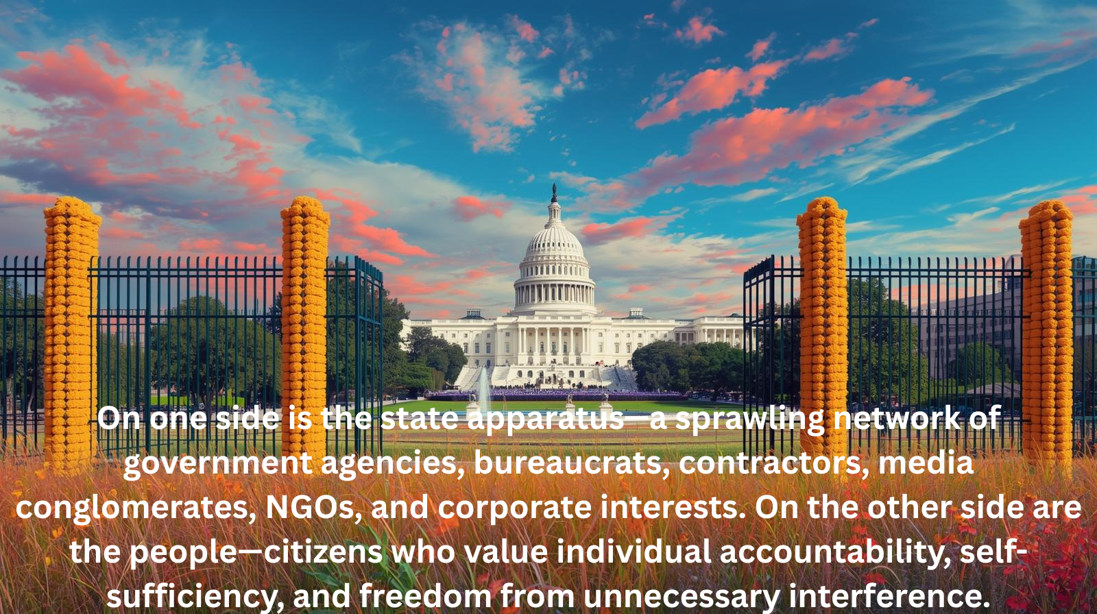 America stands at a crossroads. On one side is the state apparatus—a sprawling network of government agencies, bureaucrats, contractors, media conglomerates, NGOs, and corporate interests. On the other side are the people—citizens who value individual accountability, self-sufficiency, and freedom from unnecessary interference. This is not a mere policy debate; it is a fundamental clash between centralized power and personal liberty.