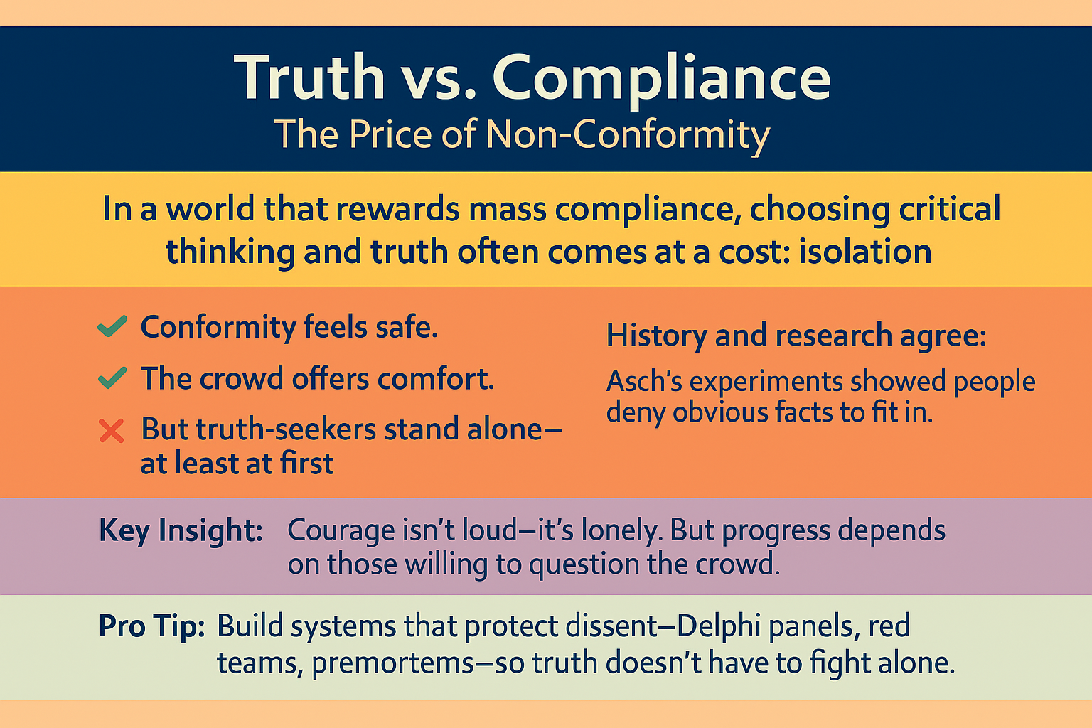 💡 Pro Tip: In a world that often rewards mass compliance, it’s crucial to build systems that protect dissent—Delphi panels, red teams, premortems—so truth doesn’t have to fight alone.