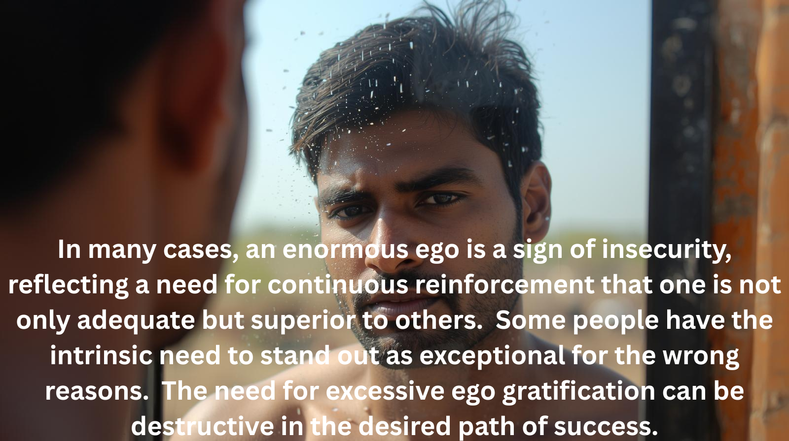 In many cases, an enormous ego is a sign of insecurity, reflecting a need for continuous reinforcement that one is not only adequate but superior to others. Some people have the intrinsic need to stand out as exceptional for the wrong reasons. The need for excessive ego gratification can be destructive in the desired path of success.