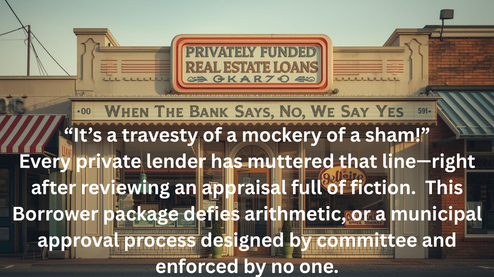 Every private lender has muttered that line—right after reviewing an appraisal full of fiction. This Borrower package defies arithmetic, or a municipal approval process designed by committee and enforced by no one.