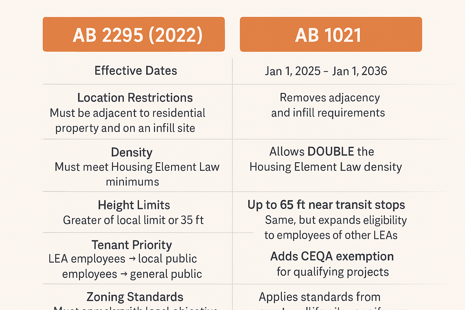 · AB 2295 (2022) laid the foundation for housing on school-owned land. AB 1021 builds on it with significant enhancements: