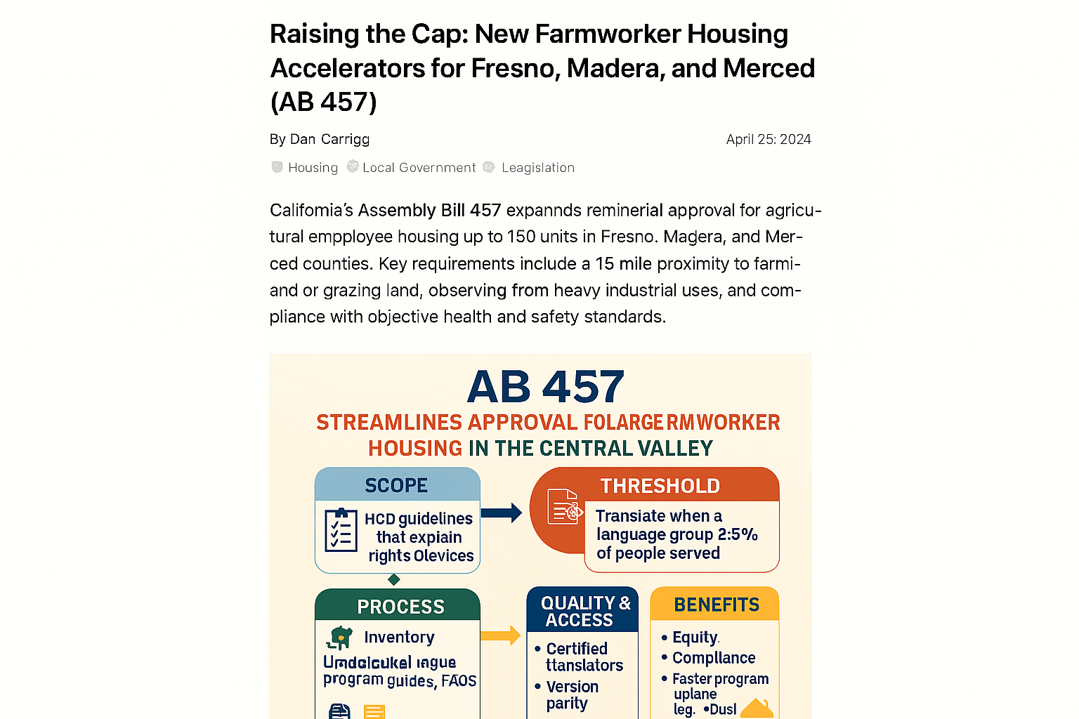 AB 457 builds on prior reforms, such as AB 1783 (2019) and AB 3035 (2024), signaling a trend toward state-led streamlining of rural housing. Expect increased interest from nonprofit developers and housing authorities, who will leverage this Law to deliver multi-phase projects near major agricultural corridors.
