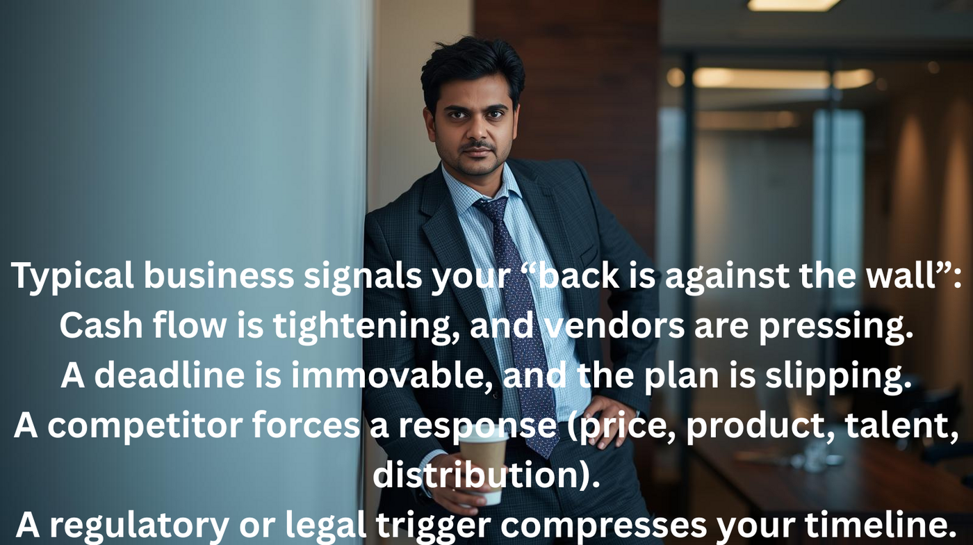 In business, there’s a moment when the runway shortens, the clock accelerates, and “optional” turns into “necessary,” Creating a sense of urgency that compels quick decisions. That’s exactly what people mean when they say their back is against the wall—a situation where you’re hard-pressed, out of easy options, and forced to act.