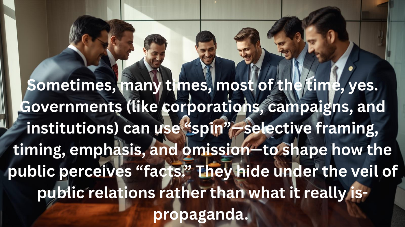Sometimes, many times, most of the time, yes. Governments (like corporations, campaigns, and institutions) can use “spin”—selective framing, timing, emphasis, and omission—to shape how the public perceives “facts.” They hide under the veil of public relations rather than what it really is- propaganda.