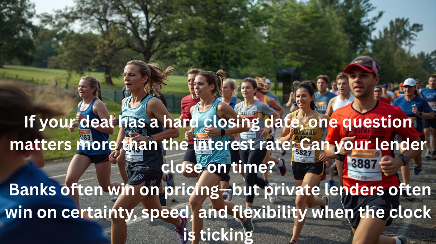 If your deal has a hard closing date, one question matters more than the interest rate: Can your lender close on time? Banks often win on pricing—but private lenders often win on certainty, speed, and flexibility when the clock is ticking.