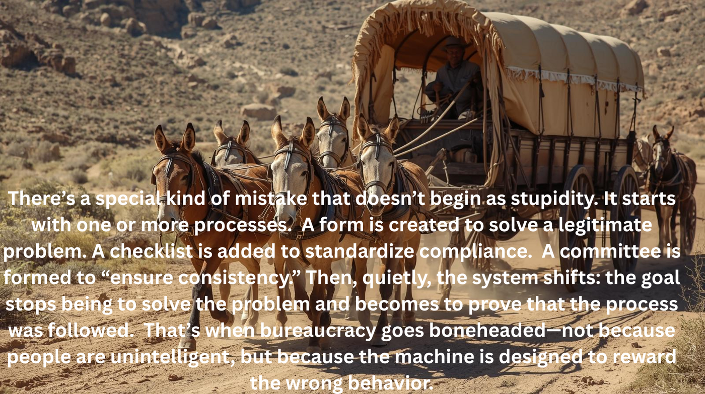 A competent system is not one where no one makes mistakes. It’s one in which errors are identified early, corrected quickly, and used to improve the design. Boneheaded bureaucracy does the opposite: it makes mistakes harder to admit, slower to fix, and easier to repeat—at scale.