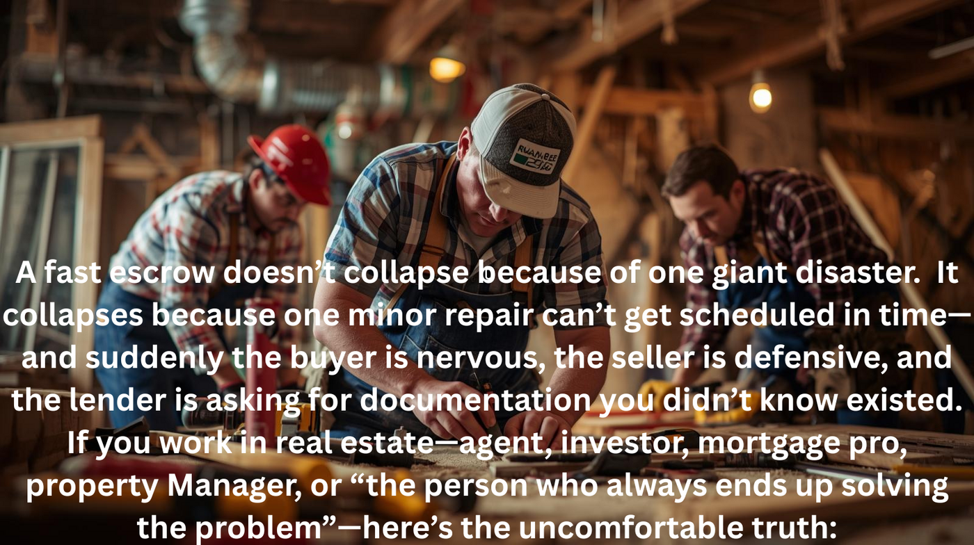 A fast escrow doesn’t collapse because of one giant disaster. It collapses because one minor repair can’t get scheduled in time—and suddenly the buyer is nervous, the seller is defensive, and the lender is asking for documentation you didn’t know existed. If you work in real estate—agent, investor, mortgage pro, property Manager, or “the person who always ends up solving the problem”—here’s the uncomfortable truth: