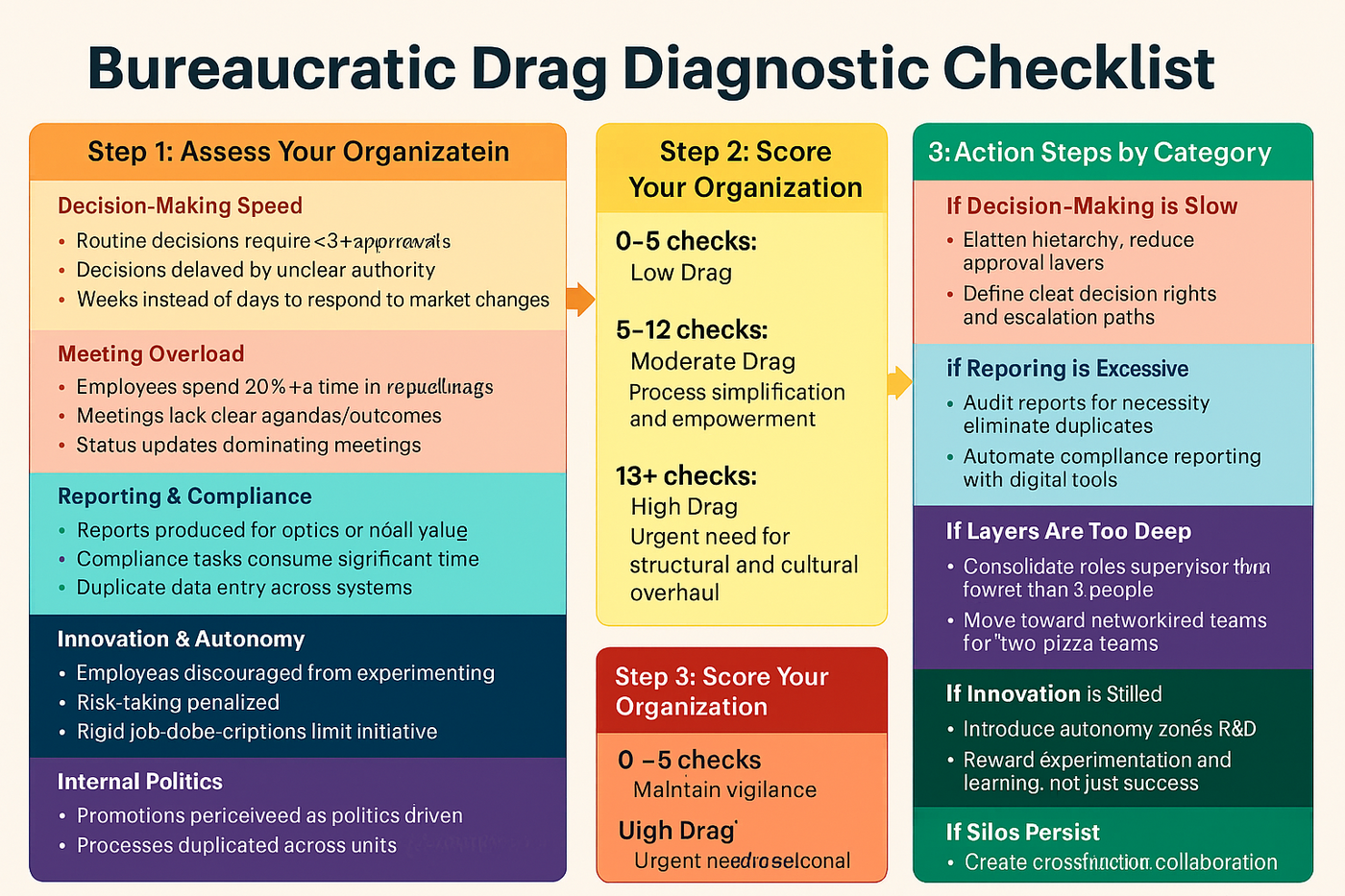 Reducing bureaucratic drag requires deliberate action to streamline processes and empower employees. Practical strategies like process simplification and decentralization help leaders feel capable and in control of change.