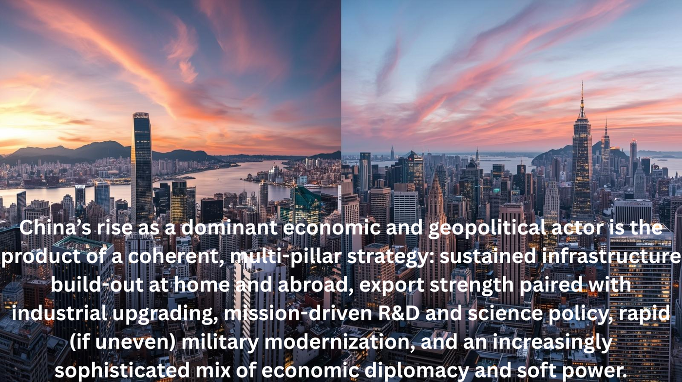 China’s rise as a dominant economic and geopolitical actor is the product of a coherent, multi-pillar strategy: sustained infrastructure build-out at home and abroad, export strength paired with industrial upgrading, mission-driven R&D and science policy, rapid (if uneven) military modernization, and an increasingly sophisticated mix of economic diplomacy and soft power.