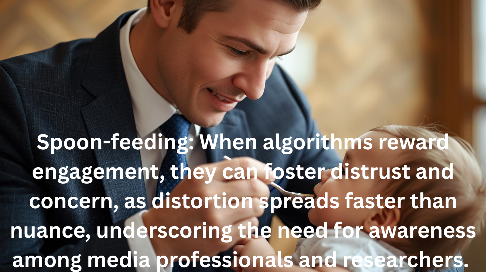Spoon-feeding: When algorithms reward engagement, they can foster distrust and concern, as distortion spreads faster than nuance, underscoring the need for awareness among media professionals and researchers.