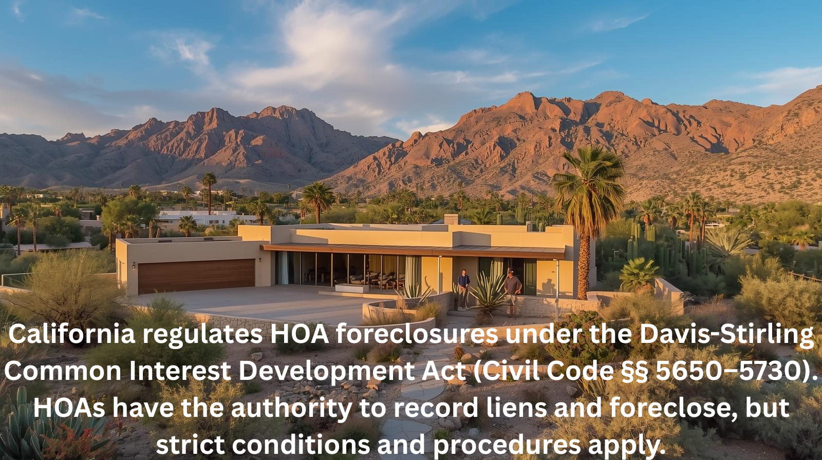 - The Davis-Stirling Act sets foreclosure rules: an HOA can foreclose only if the homeowner owes $1,800 or more in assessments or is 12 months delinquent, but the HOA foreclosure does not extinguish a senior mortgage lien.