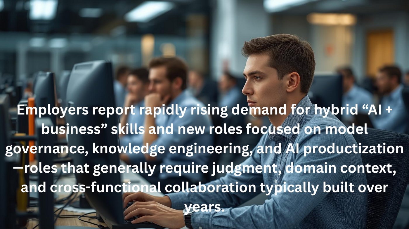 At the same time, employers report rapidly rising demand for hybrid “AI + business” skills and new roles focused on model governance, knowledge engineering, and AI productization—roles that generally require judgment, domain context, and cross-functional collaboration typically built over years.