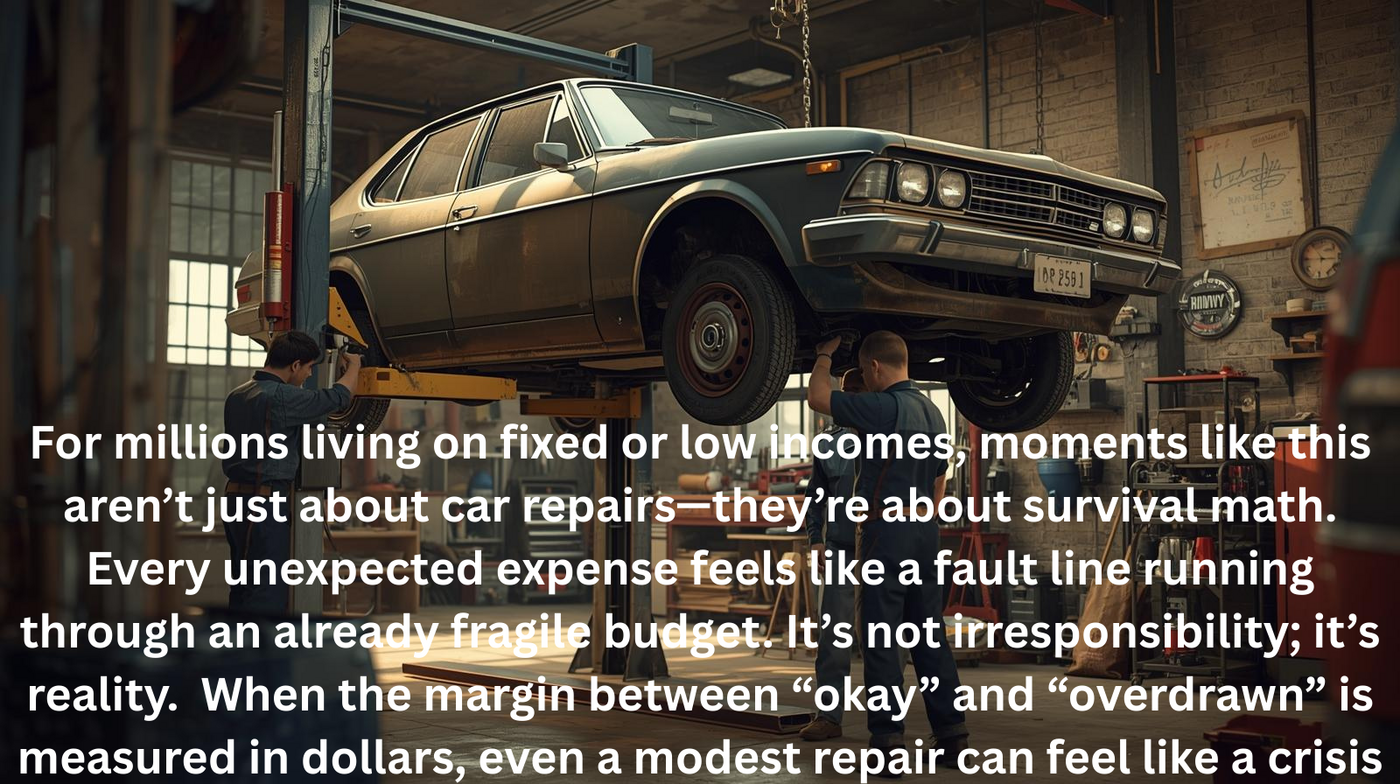For millions living on fixed or low incomes, moments like this aren’t just about car repairs—they’re about survival math. Every unexpected expense feels like a fault line running through an already fragile budget. It’s not irresponsibility; it’s reality. When the margin between “okay” and “overdrawn” is measured in dollars, even a modest repair can feel like a crisis. Behind every statistic is a person weighing groceries against gas, safety against solvency, dignity against debt. If nothing else, let’s remember this: financial stress isn’t a character flaw—it’s a condition. And conditions can be changed if we choose to care enough to build systems that give people room to breathe.