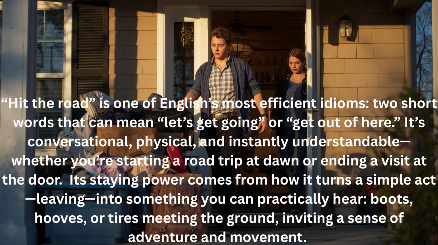 In other words, “hit the road” survives because it sounds like what it means. The phrase isn’t a dictionary definition; it’s a tiny scene: someone turns, steps out, and the world begins moving.