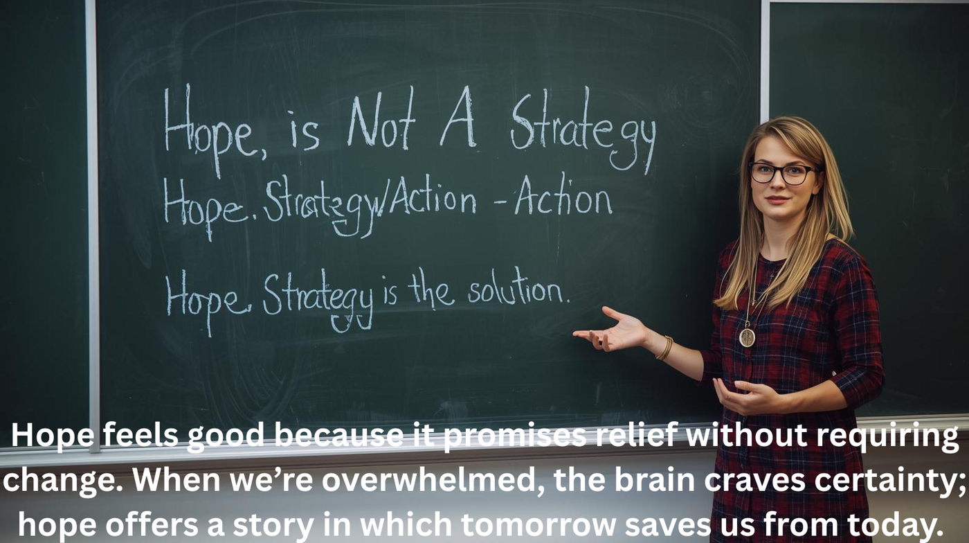 Hope feels good because it promises relief without requiring change. When we’re overwhelmed, the brain craves certainty; hope offers a story in which tomorrow saves us from today.