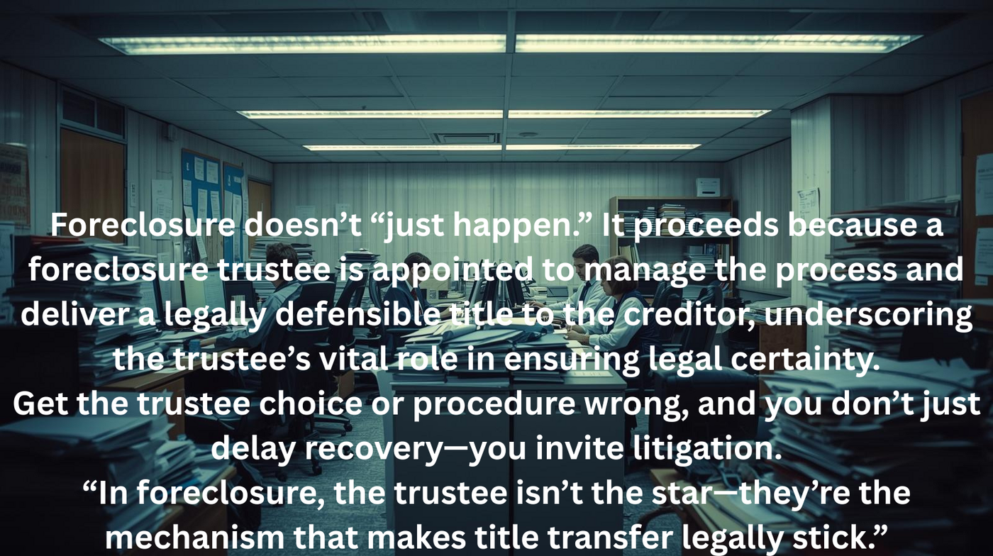 “In foreclosure, the trustee isn’t the star—they’re the mechanism that makes title transfer legally stick.”