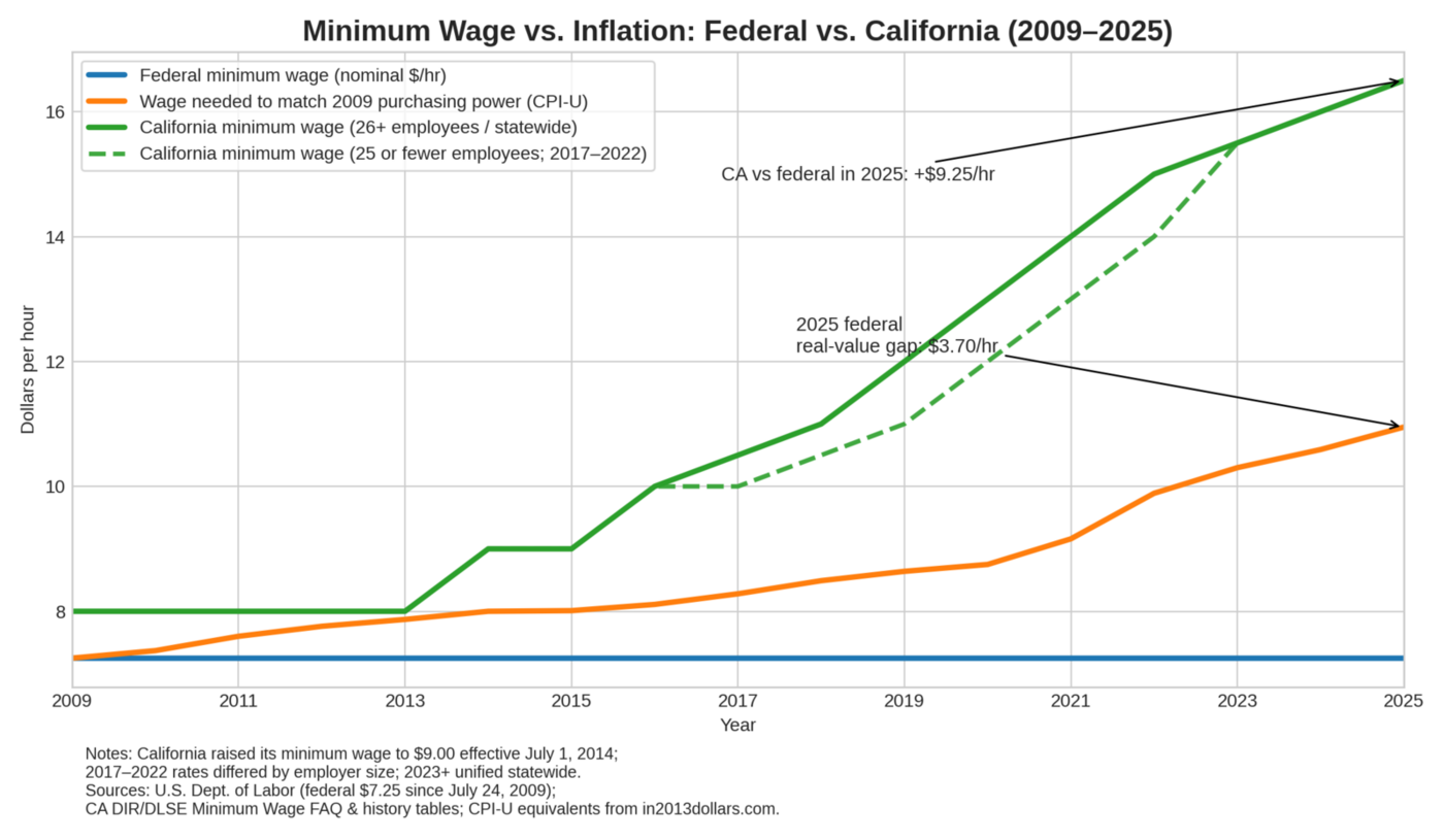 Inflation has sharply reduced the real purchasing power of $7.25 since 2009: using CPI-based inflation calculations, $7.25 in 2009 buys roughly what ~$10.95 buys in 2025 (about a ~51% price increase over that period). Put differently: even where federal Law sets the floor, the floor has effectively sunk.