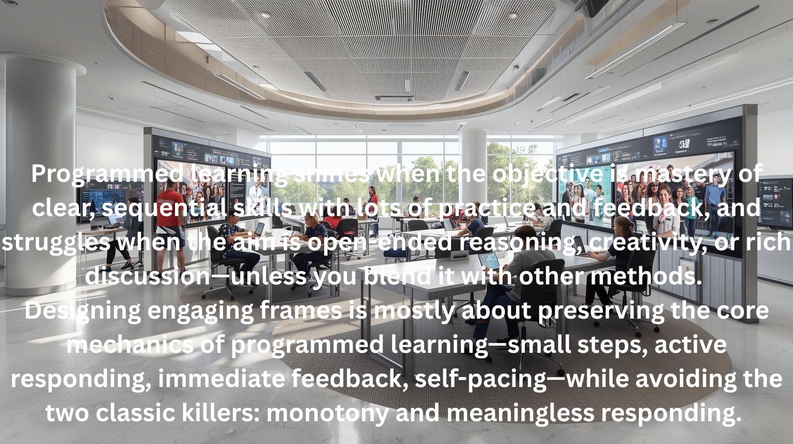 Designing engaging frames is mostly about preserving the core mechanics of programmed learning—small steps, active responding, immediate feedback, self-pacing—while avoiding the two classic killers: monotony and meaningless responding.