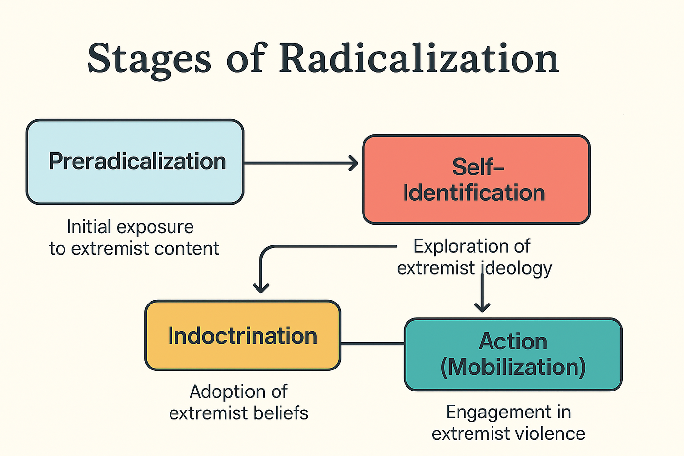 Stages of radicalization, based on research in psychology, sociology, and counterterrorism studies: