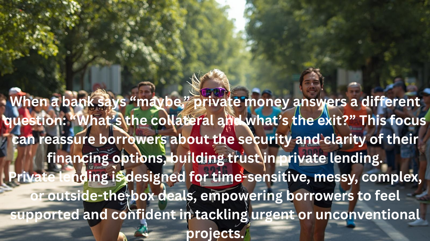 Private lending is designed for time-sensitive, messy, complex, or outside-the-box deals, empowering borrowers to feel supported and confident in tackling urgent or unconventional projects.