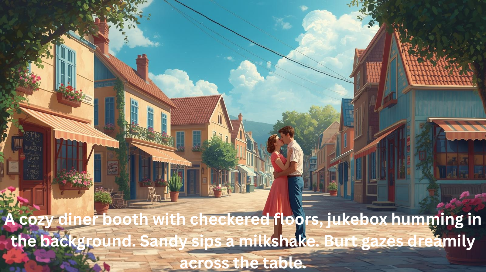 A cozy diner booth with checkered floors, jukebox humming in the background. Sandy sips a milkshake. Burt gazes dreamily across the table.