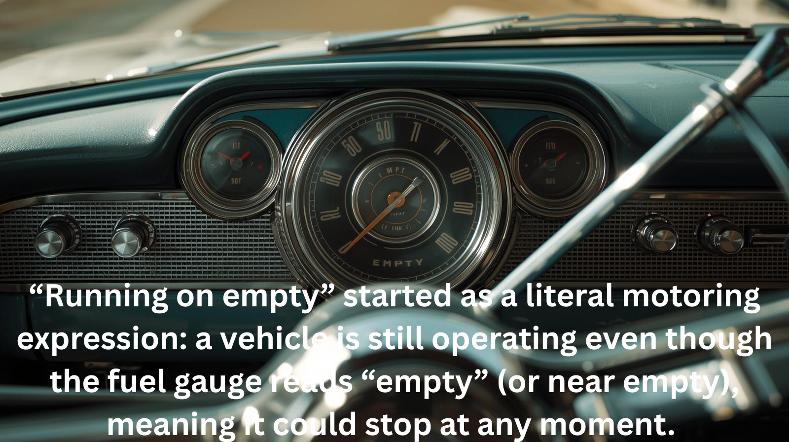 “Running on empty” derives from the image of a car nearly out of gas and has since evolved into an idiom for pushing on with depleted resources, with major popularization in the late 1970s through Jackson Browne’s song.