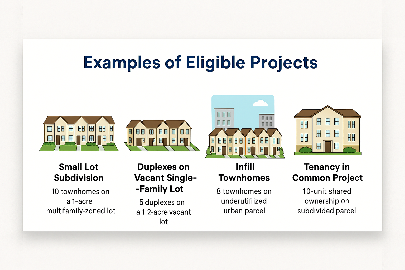 - SB 1123: Expands eligibility to vacant single-family-zoned lots (≤ 1.5 acres).