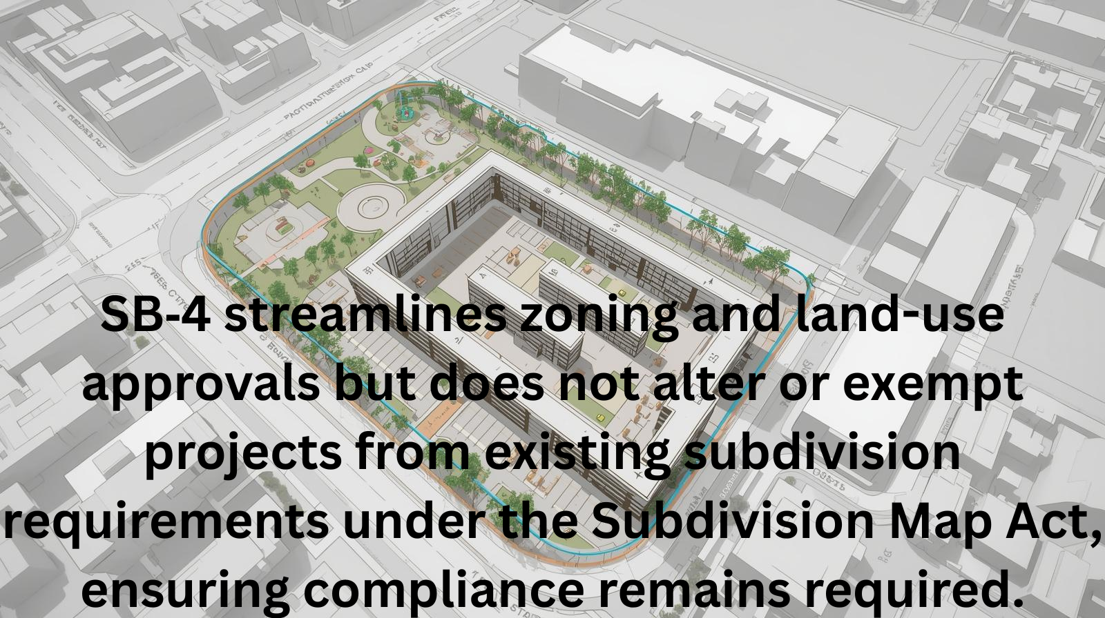 - SB‑4 is a use-by-right development statute, not a subdivision statute—no part of SB‑4 references subdivision exemptions or changes to the Subdivision Map Act.