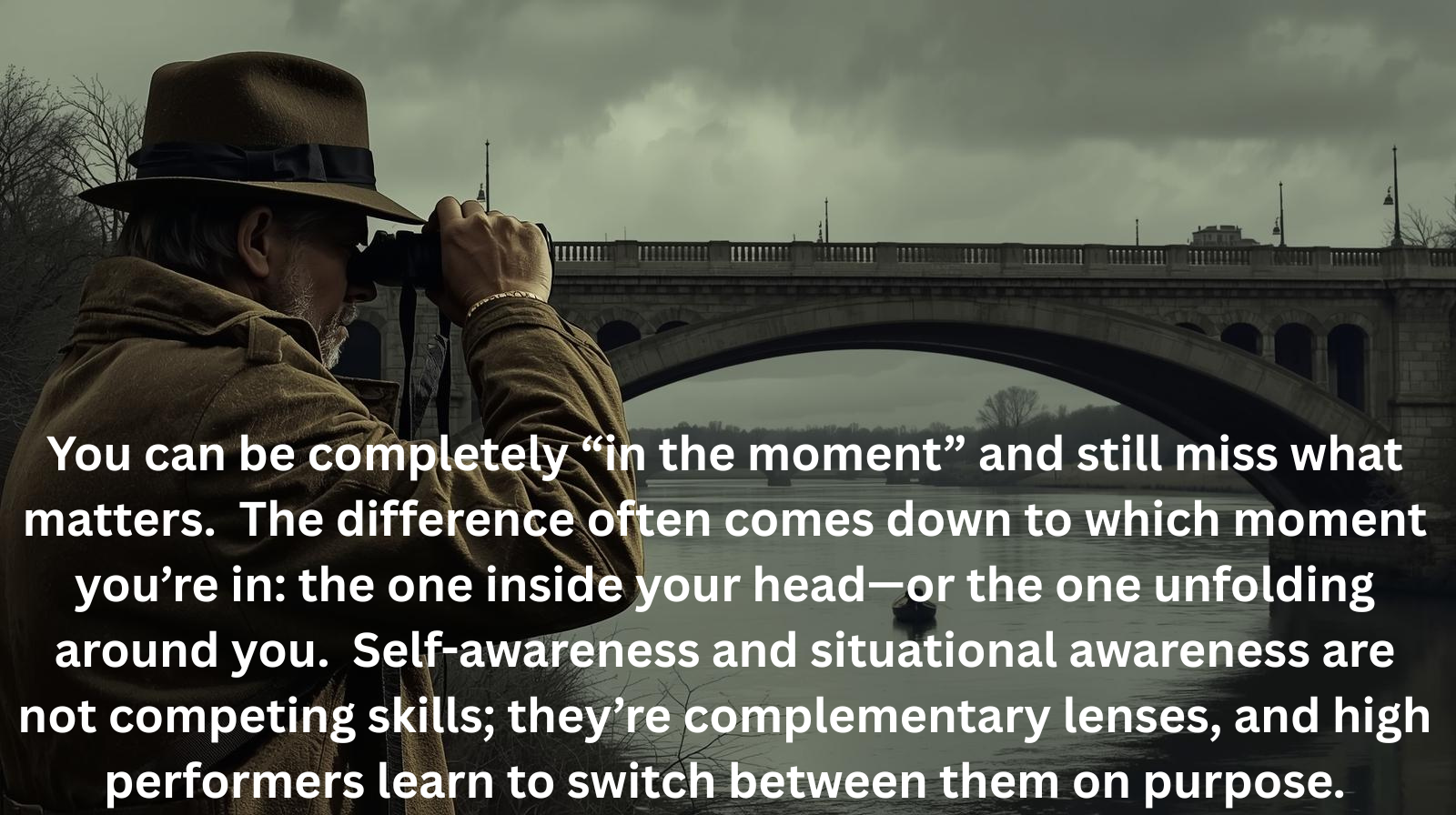 You can be completely “in the moment” and still miss what matters. The difference often comes down to which moment you’re in: the one inside your head—or the one unfolding around you. Self-awareness and situational awareness are not competing skills; they’re complementary lenses, and high performers learn to switch between them on purpose.