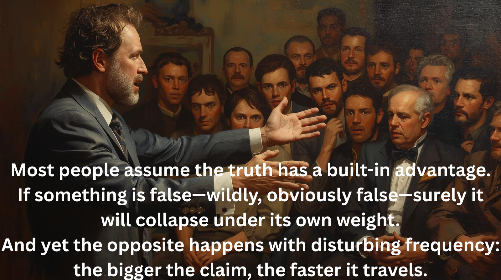 Most people assume the truth has a built-in advantage. If something is false—wildly, obviously false—surely it will collapse under its own weight. And yet the opposite happens with disturbing frequency: the bigger the claim, the faster it travels.