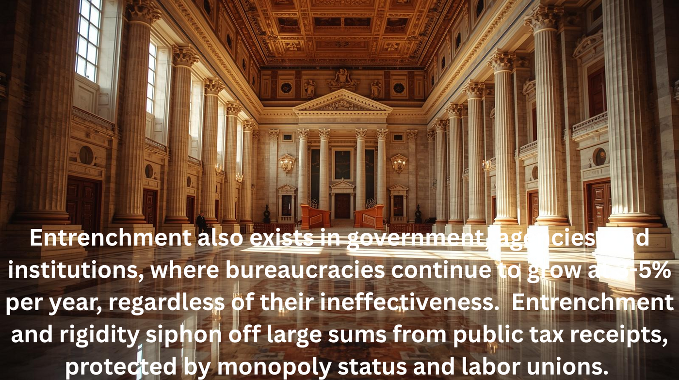 Entrenchment also exists in government, agencies, and institutions, where bureaucracies continue to grow at 3-5% per year, regardless of their ineffectiveness. Entrenchment and rigidity siphon off large sums from public tax receipts, protected by monopoly status and labor unions.